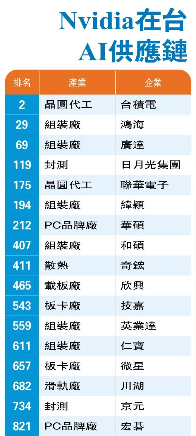 如今,Nvidia的AI供应链中近半公司都是台厂,其中登上亚洲周刊华商1000排行榜的台企数量就多达17家(见「Nvidia在台AI供应链」列表)之多,并且涵盖了芯片生产中的每个环节。