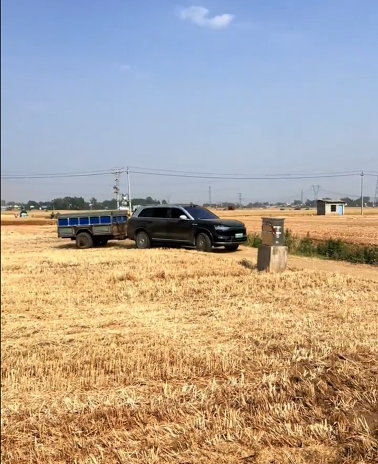 从视频来看,这不是一次单纯的作秀,是真的在拉麦子,通过挂钩的方式将拖车挂在车后,问界M9在田地里丝滑转弯与加速,车身也是被灰尘所覆盖。