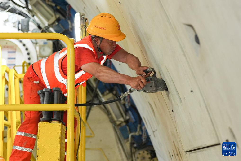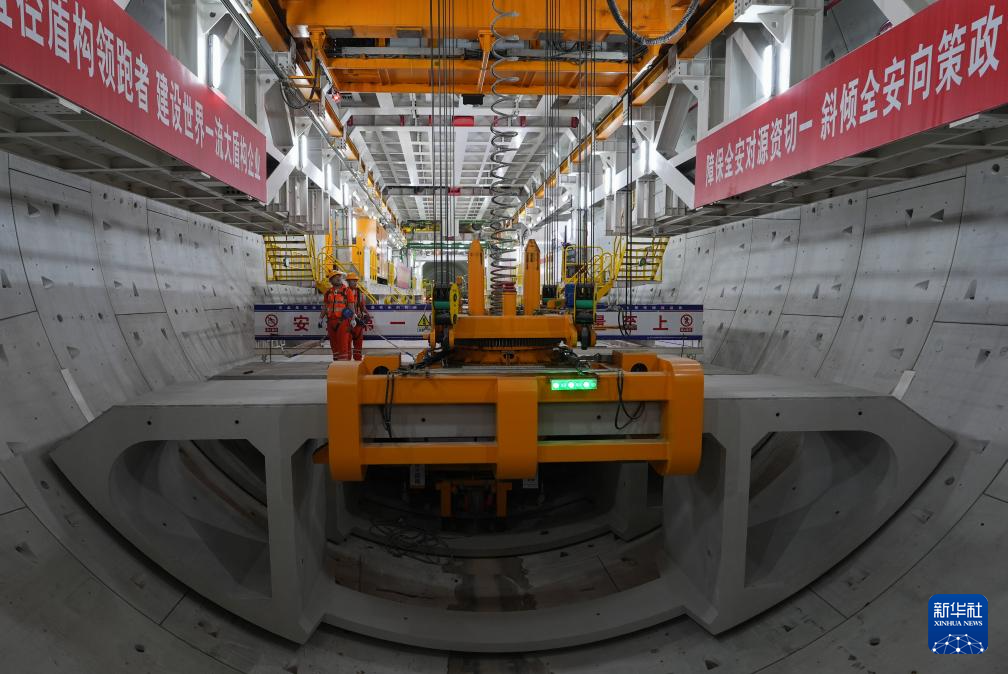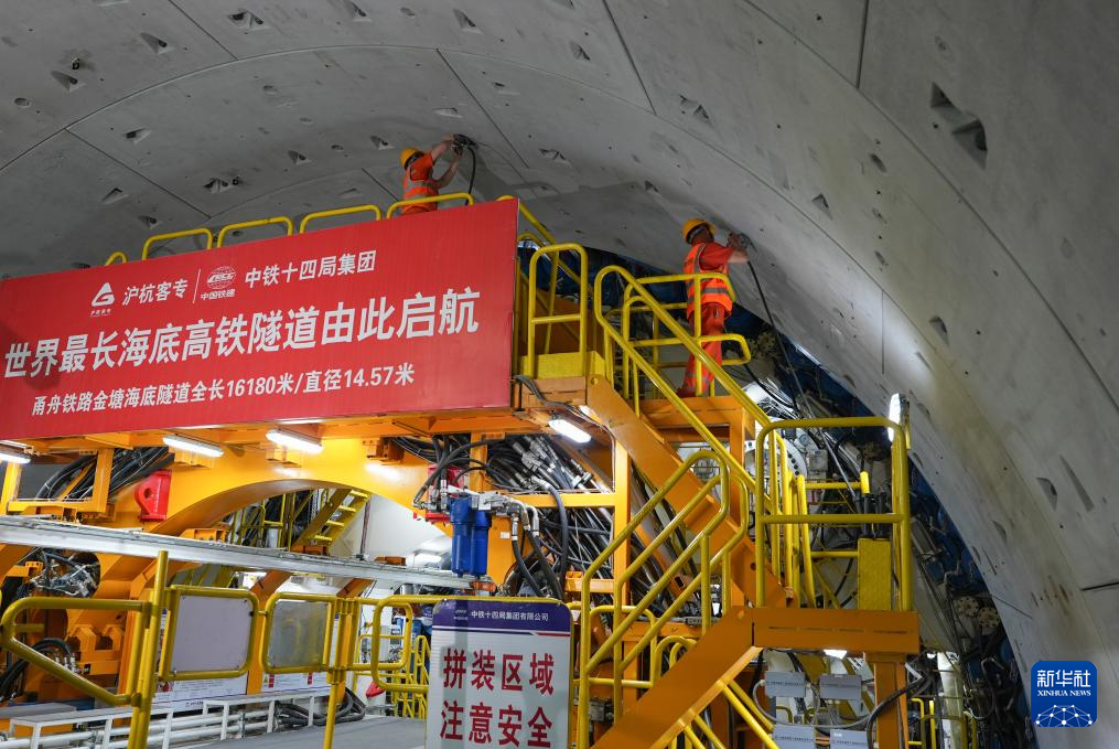 5月29日,中铁十四局施工人员在甬舟铁路金塘海底隧道“甬舟号”盾构机内进行管片拼装作业。