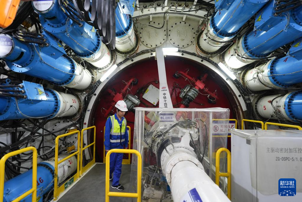 5月29日,中铁十四局技术人员在甬舟铁路金塘海底隧道“甬舟号”盾构机内关注设备运行情况。
