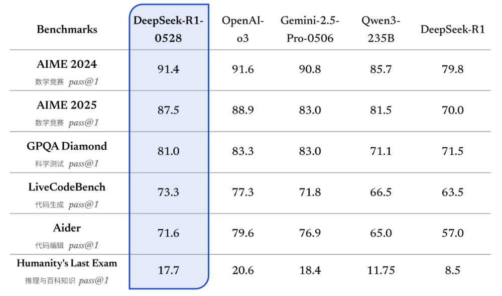 更新后的 R1 模型在数学、编程与通用逻辑等多个基准测评中取得了当前国内所有模型中首屈一指的优异成绩,并且在整体表现上已接近其他国际顶尖模型,如 o3 与 Gemini-2.5-Pro。