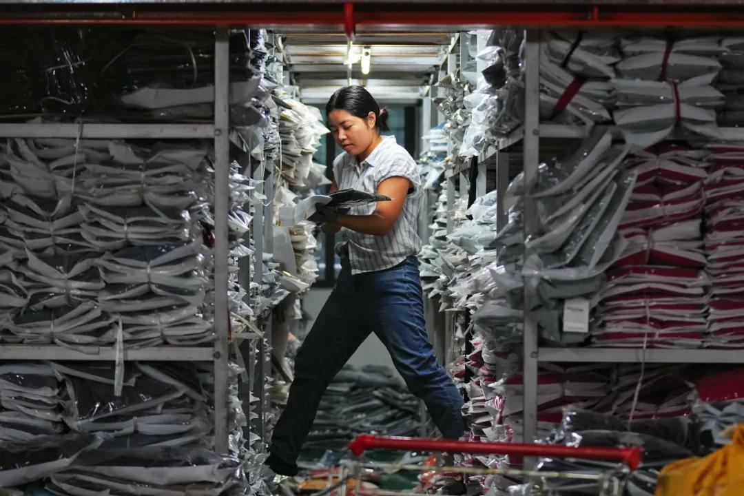 ▲女装厂工人正在分拣