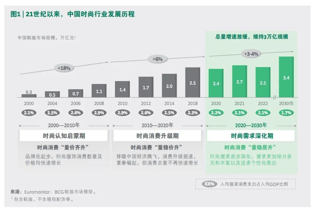 波士顿咨询在《中国时尚行业的下一个十年》报告中提出一个观点:2010年-2020年,中国服饰行业的总趋势是「量稳价升」;2020年-2023年将是「量稳质升」、质大于量的阶段。
