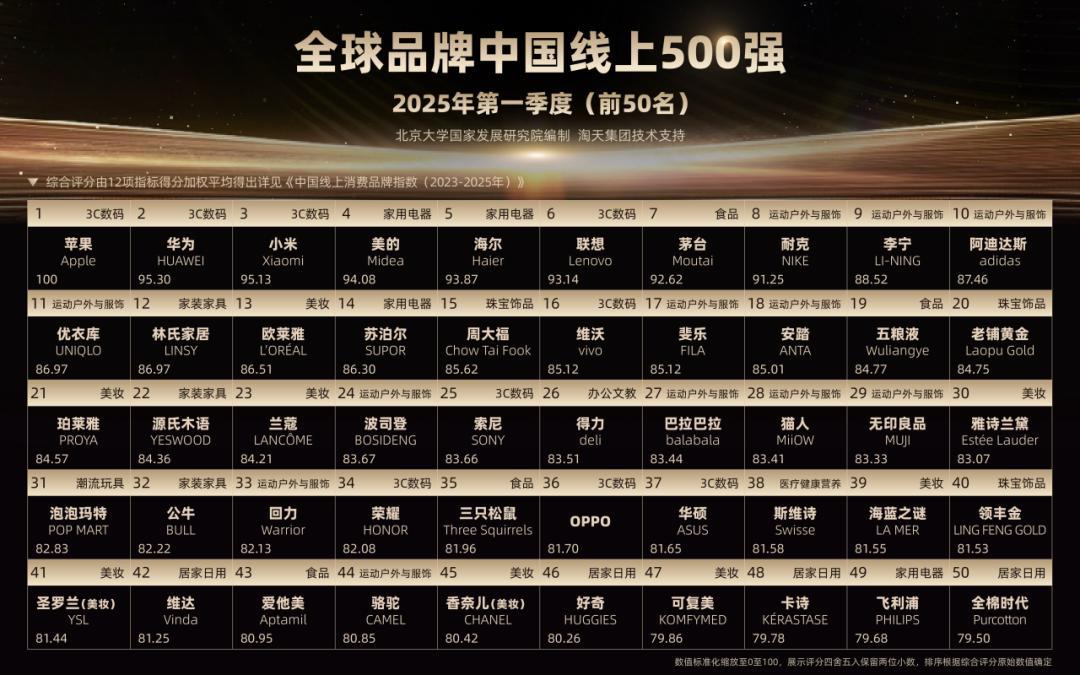 这份榜单是「中国线上消费品牌指数(CBI)」的产物。该指数由淘宝天猫提供技术支持,依托消费者实际购买行为,在销售、价格、搜索、好评等维度构建反映品牌质量的综合性指数,希望引导线上消费市场走向品质竞争。