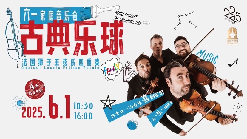 6月1日,2场家庭音乐会将在上海音乐厅上演。日内瓦国际音乐大奖得主、中法文化年特邀亲子剧目——法国狮子王弦乐四重奏,带来“古典乐球”主题音乐会。演出中,四重奏以独特幽默感,将妖娆探戈、迷幻摇滚,以及法国歌后伊迪丝・琵雅芙和交响乐之父海顿的作品巧妙混搭,从古怪杂音中演绎和谐之美,奇幻灯光设计更添沉浸感。