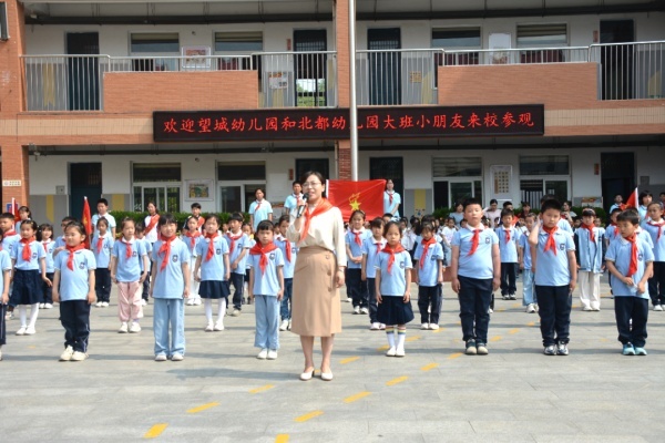 接着,学校大队部的大队委哥哥姐姐们带着幼儿园的小朋友参观校园,为他们介绍校园文化和设施。幼儿园的小朋友还观看了升旗仪式与入队仪式,近距离看到一年级学生佩戴红领巾的神圣时刻,聆听着少先队员铿锵有力的宣誓声,小朋友们眼中满是羡慕与向往,对成为一名小学生充满了期待。