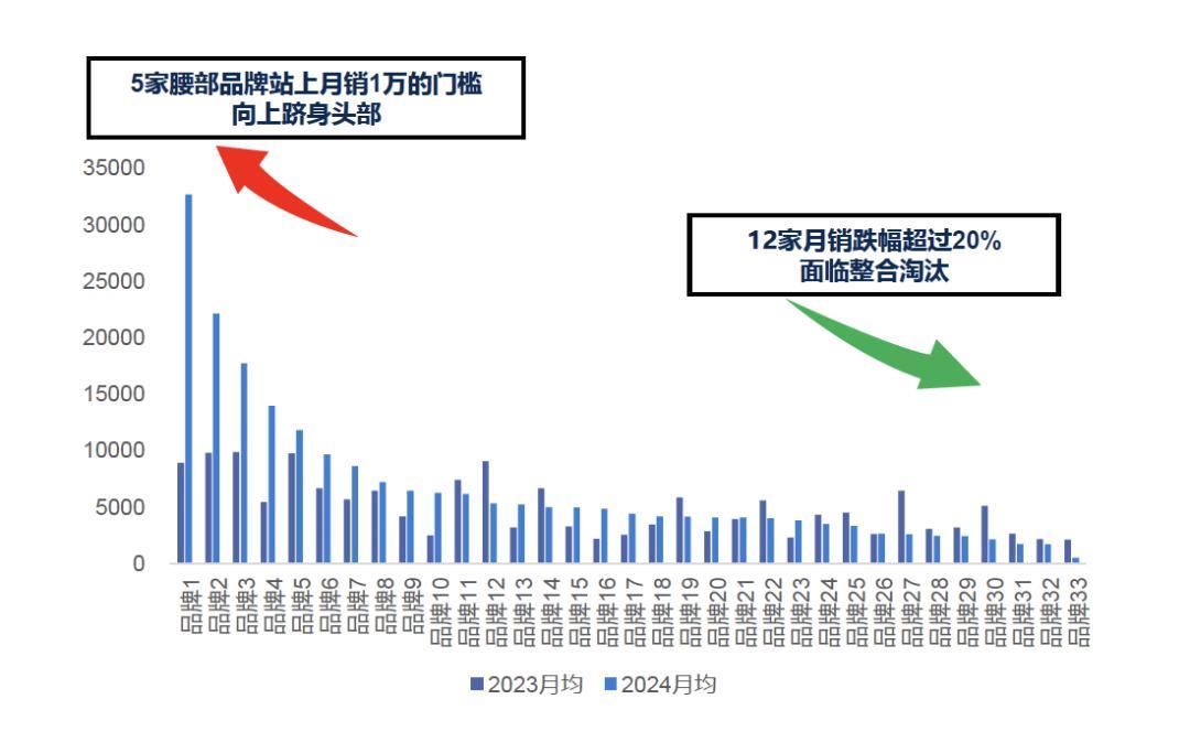 要知道,智能电动汽车的竞争已经进入淘汰赛。里斯咨询报告显示,2023 年月销量 2000-1万的33 家腰部新能源品牌加速向两端分化。其中5家腰部品牌跨过月销1万的门槛向上跻身头部;而12家品牌月销跌幅则超过20%,面临整合淘汰。