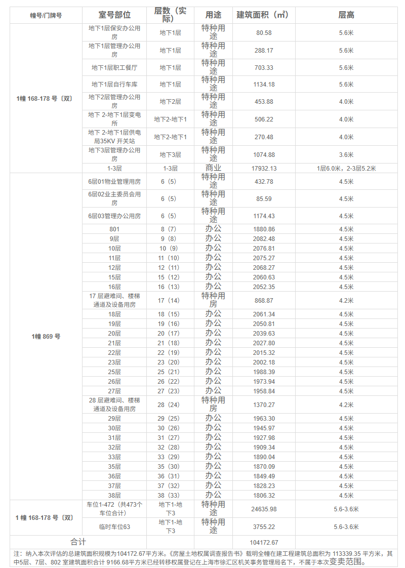 资料显示,拍卖物被上海市徐汇区人民法院正式查封,上海金融法院轮候查封。地下3_地下1层机动车库、管理办公用房等、地下1层超市及店铺、1_4.17_25.27_35层、5_15层等部位被抵押给了某银行上海分行;登记证明号:沪(2021)徐字不动产证不动产权证明第04014296号。