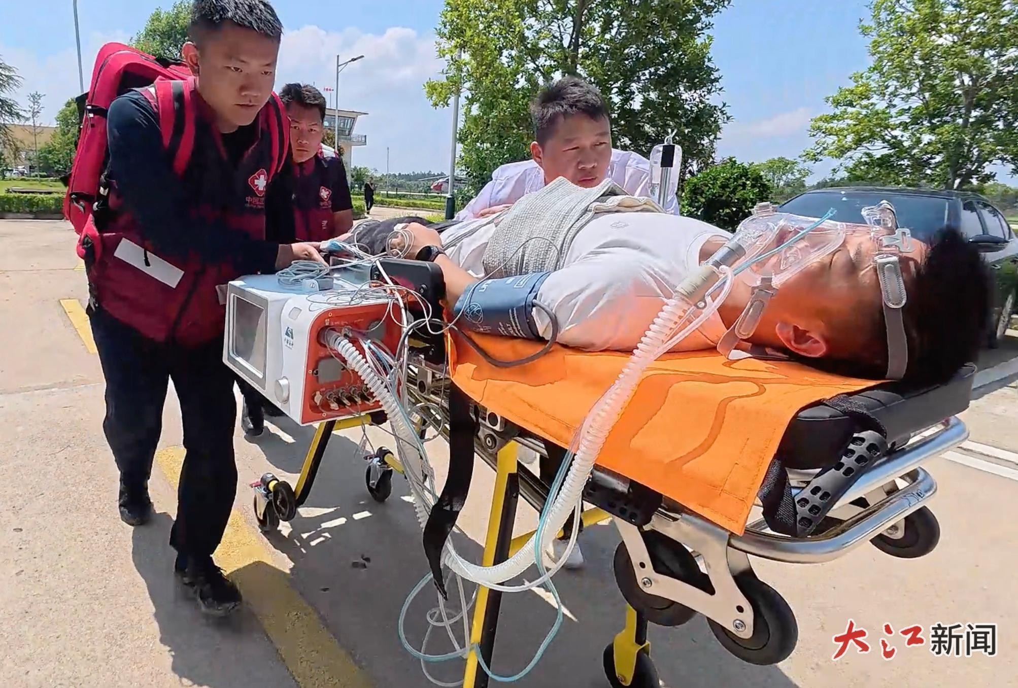 演练当天,接到江西省航空护林局救援指令的“急救(转运)直升机”,迅速飞抵靖安机场。救援人员用担架把2名重伤员转移到“直升机机载医疗救护装备”上,在现场和转运途中连续实施“呼吸、监护和输注”等高级生命支持,机上伤员医疗数据信息与急救中心远程实时交互,有效保障了伤员生命安全。