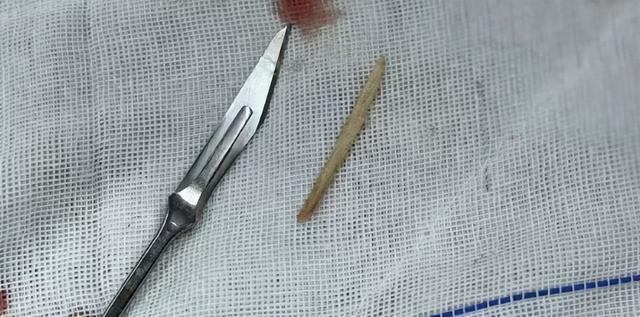 胡奇副主任医师凭借丰富经验,熟练运用手术器械,将鱼刺与周围组织抽丝剥茧,最终完整取出长约5厘米的鱼刺,在场医护人员高高悬起的心也终于安稳落下。