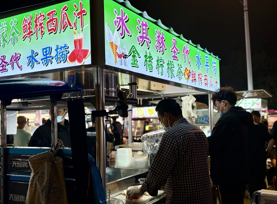 徐州烧烤、盱眙小龙虾、温州瘦肉丸、东北大饭包、贵州糯米饭、江西炒粉,还有各种果汁、奶茶和甜点……一排排餐车整齐停放在露天广场上,每个摊位前都围满了人,一眼望不到头。难怪有人打趣,“在这里,一口气能吃到半个中国的美食”。