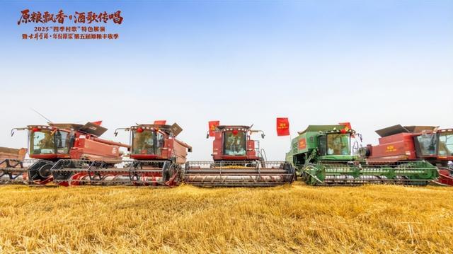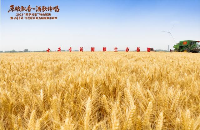 在古井贡酒原粮生态基地,随着一声响亮的号令,数十台大型联合收割机一齐发动,风吹麦浪中,古井贡酒·年份原浆酿酒专用小麦开镰收割仪式正式开始!