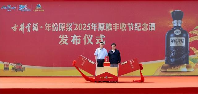 许春樵与古井集团党委委员、股份公司常务副总经理闫立军共同发布古井原粮丰收大坛纪念酒。