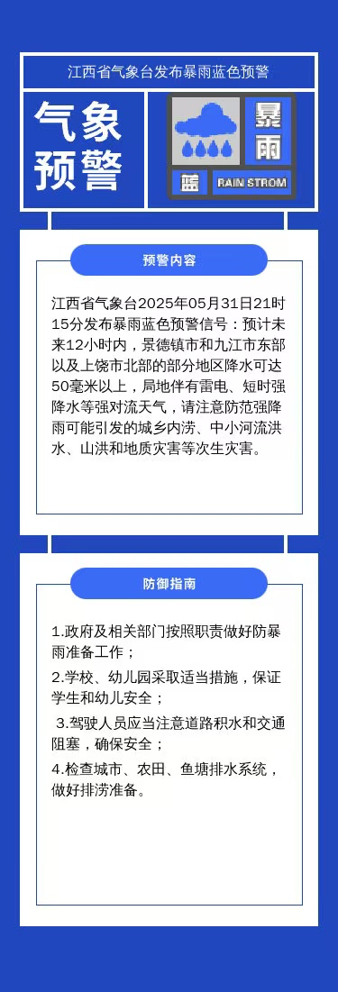 江西省气象台2025年05月31日21时15分发布暴雨蓝色预警信号。