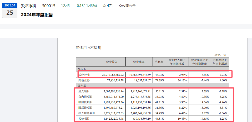 从具体业务来看,报告期内,作为营收的三大重点产品,屈光项目、白内障项目、视光服务项目合计营收占比达78.02%,营收增速分别录得:2.31%、4.87%、6.42%,而上一年同期分别录得:17.27%、55.24%、31.25%。可见,2024年度,该三个核心产品的营收增速放缓。