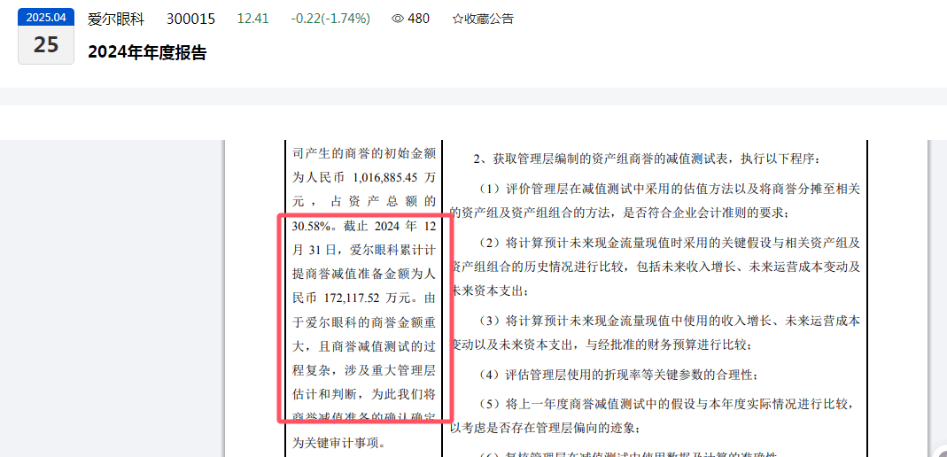 值得留意的是,爱尔眼科如此规模的商誉,在2024年度报告中被审计机构确定为关键审计事项。