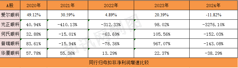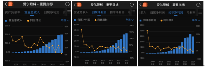从营收增速来看,近五年即2020年-2024年,爱尔眼科分别录得:19.24%、25.93%、7.39%、26.42%、3.02%,增速明显放缓;同期,归母净利润增速分别录得:25.01%、34.78%、8.65%、33.06%、5.87%;同时,归母扣非净利润增速分别录得:49.12%、30.59%、4.89%、20.39%、-11.82%。显然,不管是营收增速或盈利增速,爱尔眼科近五年明显放缓。