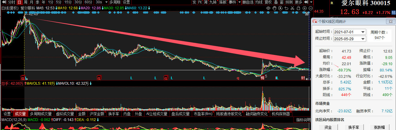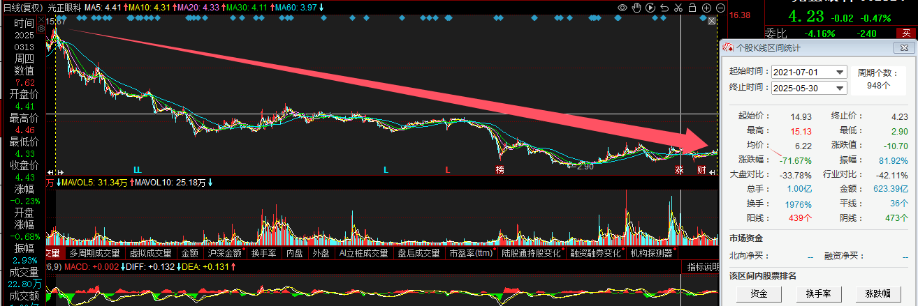 拉长时间来看,光正眼科近四年(2021年7月1日-2025年5月30日)股价整体下跌71.67%。