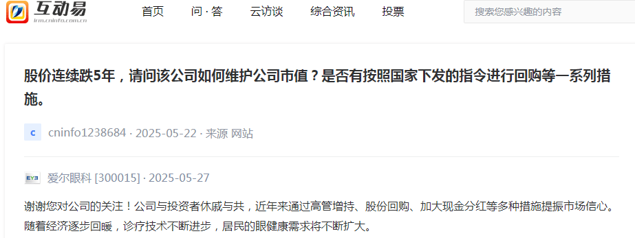 近日,有投资者在互动易平台上提问“连跌5年,请问贵公司如何看待这个问题?”、“股价连续跌5年,请问该公司如何维护公司市值?是否有按照国家下发的指令进行回购等一系列措施。”