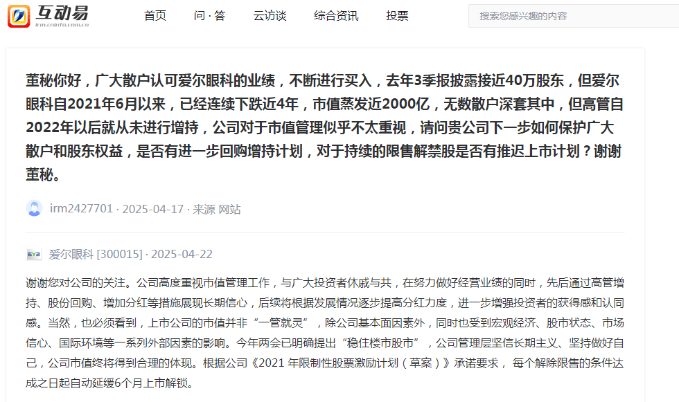 另外,上个月,更有投资者表示:广大散户认可爱尔眼科的业绩,不断进行买入,去年3季报披露接近40万股东,但爱尔眼科自2021年6月以来,已经连续下跌近4年,市值蒸发近2000亿,无数散户深套其中,但高管自2022年以后就从未进行增持,公司对于市值管理似乎不太重视,请问贵公司下一步如何保护广大散户和股东权益,是否有进一步回购增持计划,对于持续的限售解禁股是否有推迟上市计划?