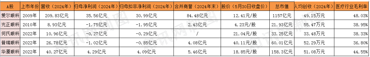 截至5月30日下午收盘,爱尔眼科报收12.41元/股(发行价28元/股,2009年上市)、普瑞眼科报收40.11元/股(发行价33.65元/股,2022年上市)、华厦眼科报收18.85元/股(发行价50.88元/股,2022年上市)、何氏眼科报收21.04元/股(发行价42.5元/股,2022年上市)、光正眼科报收4.23元/股(发行价15.18元/股,2010年上市)。