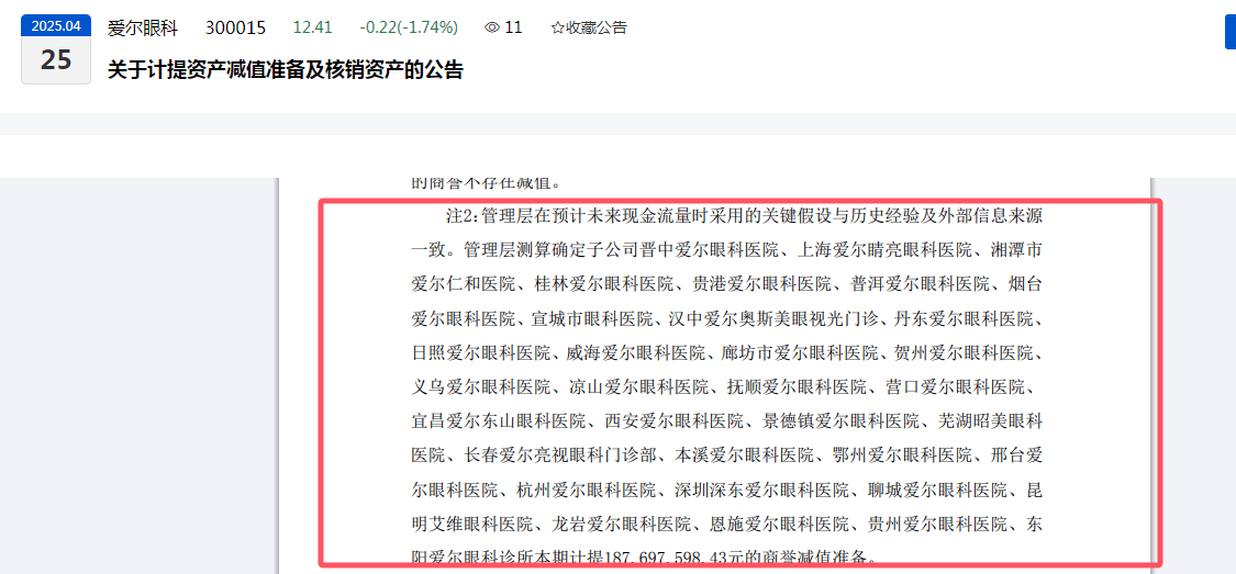 其中,2024年度,爱尔眼科对晋中爱尔眼科医院、上海爱尔睛亮眼科医院、湘潭市爱尔仁和医院、桂林爱尔眼科医院、贵港爱尔眼科医院、普洱爱尔眼科医院、烟台爱尔眼科医院等30余家子公司合计计提187,697,598.43元(约1.88亿元)的商誉减值准备。