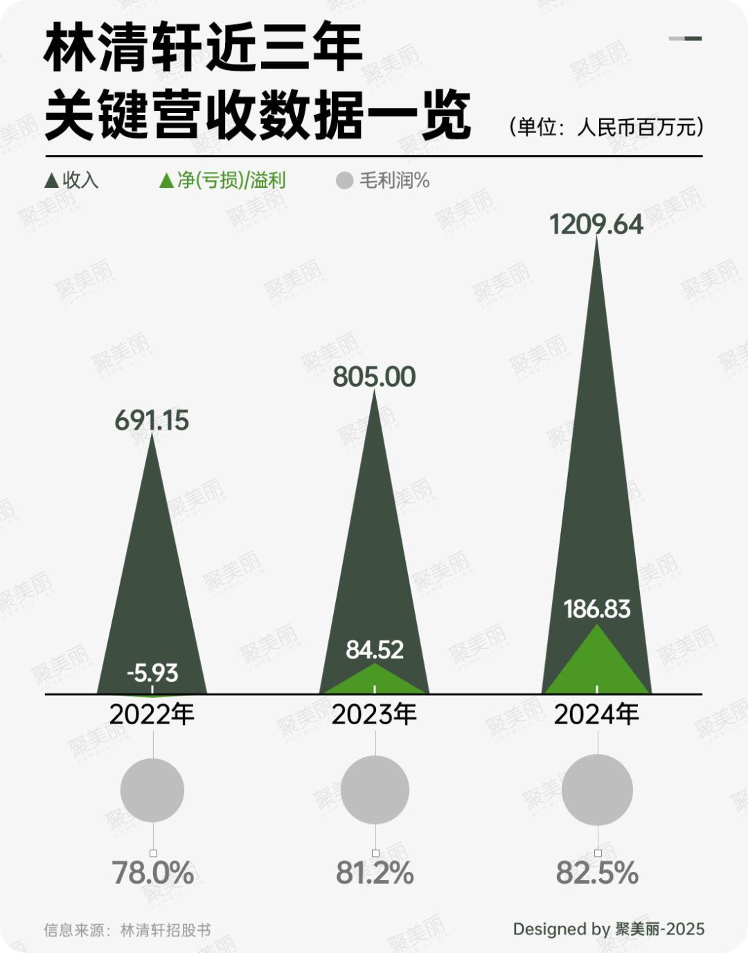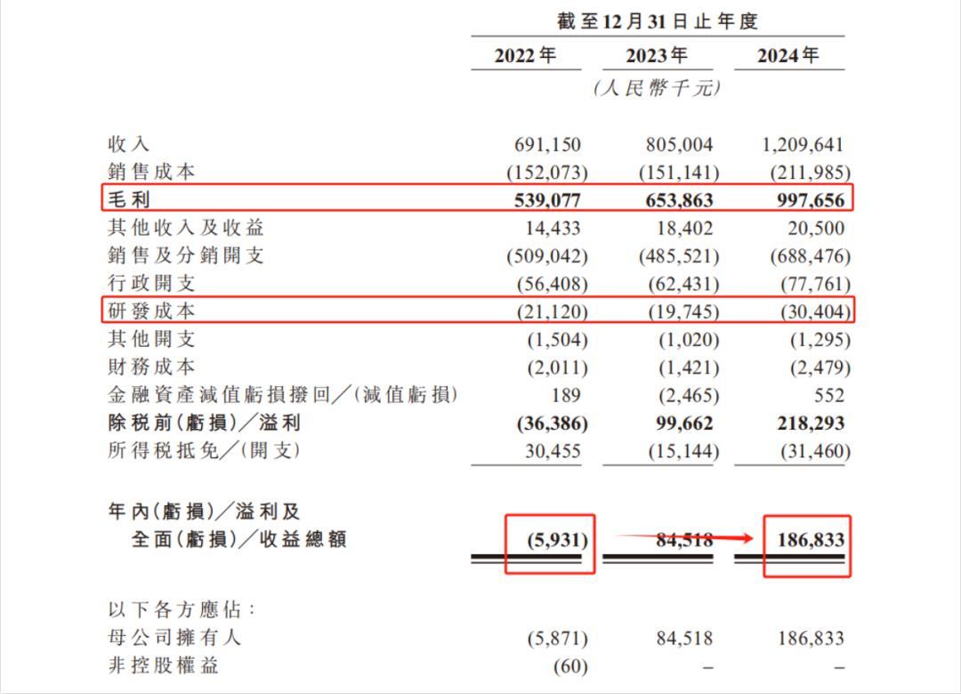在线下、线上双渠道发力的态势下,林清轩近三年的业绩表现似乎不错。据招股书显示,自2022年起,林清轩近三年营收分别为6.91亿元、8.05亿元、12.10亿元;毛利分别为539万元、654万元、998万元,毛利率同样呈逐年增长,到2024年已增至82.5%。