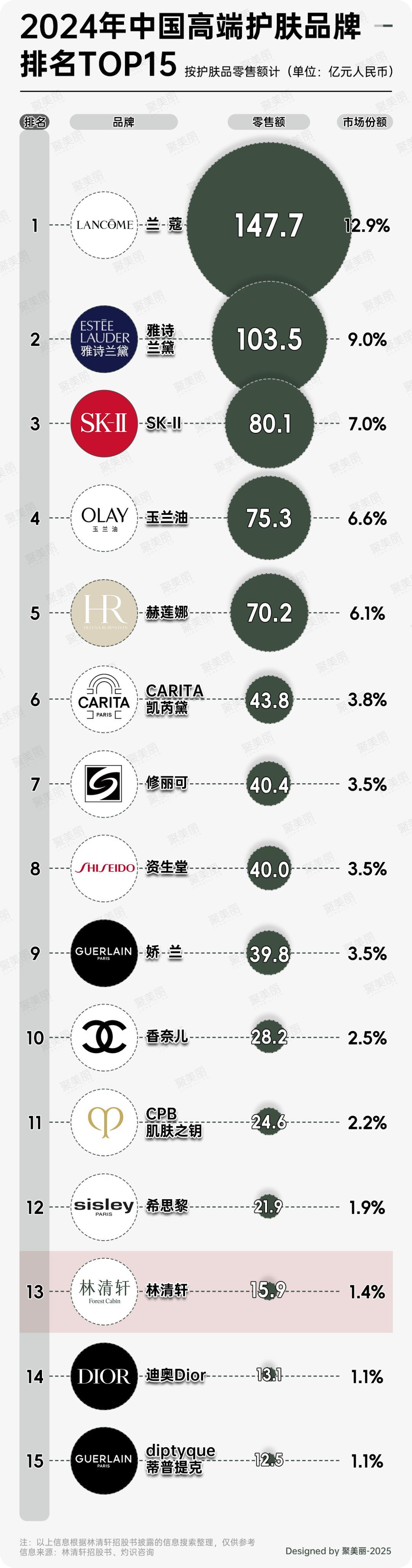 视角聚焦到林清轩品牌上,根据灼识咨询的资料,在2024,按零售额计,林清轩在中国所有高端国货护肤品牌中排名第一,也是中国前15大高端护肤品牌(包括国货及国际品牌)中唯一的国货品牌,在这之中,林清轩位列第13名。