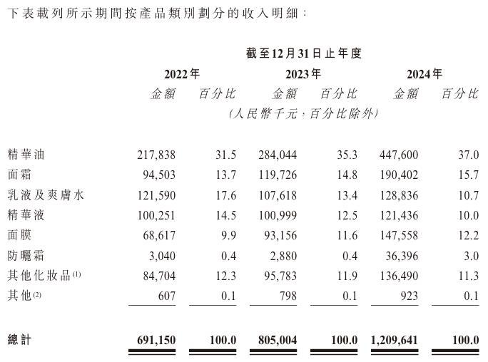 按产品类别划分,林清轩主要有6大产品,分别为精华油、面霜、乳液及爽肤水、精华液、面膜、防晒霜。其中,精华油的销售金额在2022年—2024年分别为2.18亿元、2.84亿元、4.48亿元,占比分别为31.5%、35.3%、37.0%。