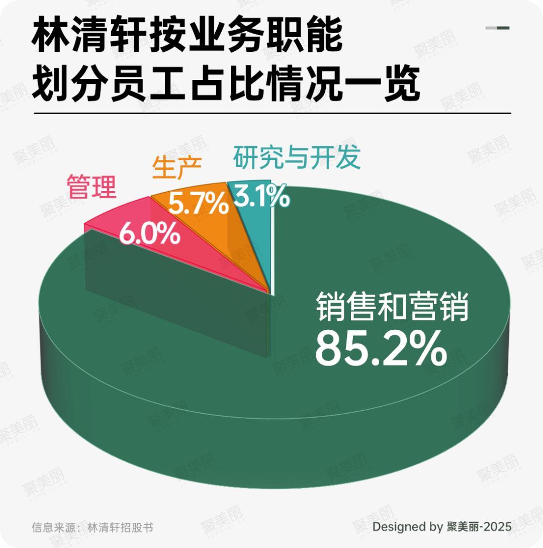 此外,招股书还披露,截至2024年12月31日,林清轩在中国共有2043名员工,从员工职能划分情况来看,销售和营销类员工占绝大多数,为85.2%,管理、生产职能员工次之,研究与开发职能的员工占比最少,为3.1%,研发人员共计64名,在植物学、生物学、皮肤学、生物化学领域拥有广泛的专业知识,其中拥有硕士以上学位的超50%。