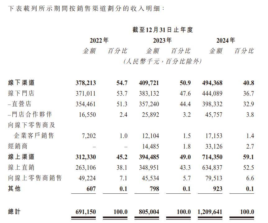 结合林清轩披露的招股书信息来看,林清轩在线上、线下渠道均有分布。其中,线上收入由2022年3.12亿元增至2024年的7.14亿元,且线上营收占比超半数,为59.1%,复合年增长率为51.2%。