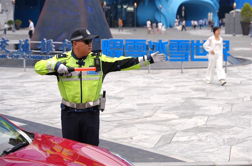 图为浦东公安分局民警在耀雪冰雪世界疏通交通