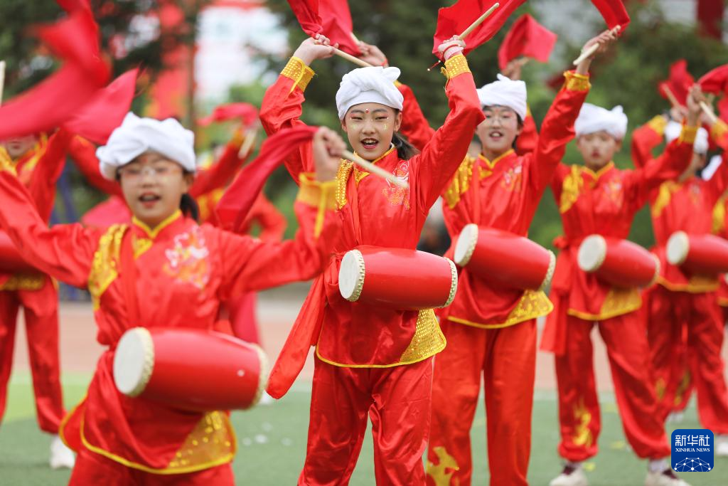 5月30日,甘肃省定西市安定区福台小学腰鼓社团的学生在表演。