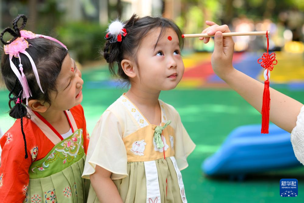 5月30日,江苏南京建邺区金地名京幼儿园的老师为小朋友点朱砂。