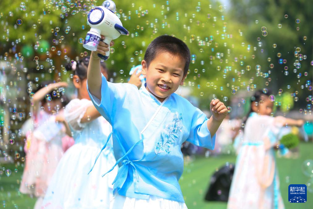 5月30日,江苏省海安市大公镇中心幼儿园的小朋友在玩泡泡游戏。