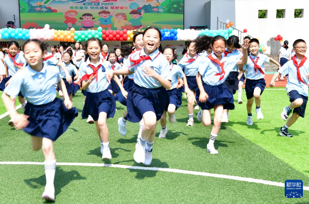 5月30日,浙江省建德市明珠小学的小学生在操场上欢庆奔跑。