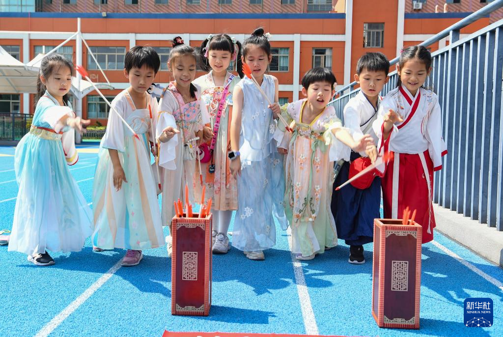 5月30日,浙江省金华市东苑小学校园里,小朋友在玩投壶游戏。