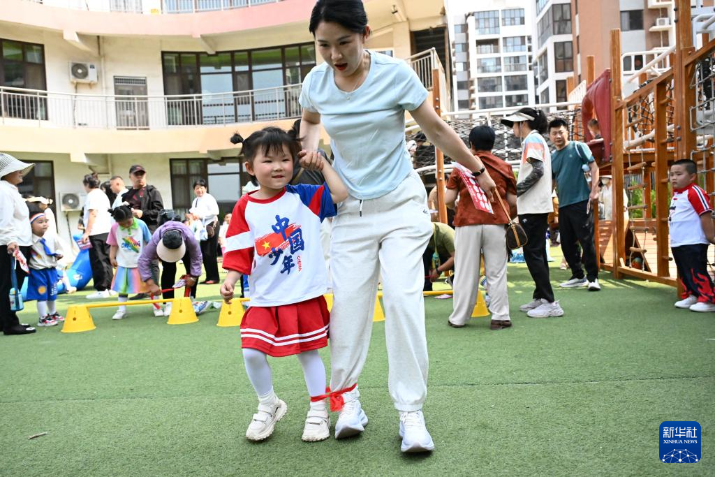 5月30日,山东省青岛市即墨区桃源河路幼儿园的小朋友和家长一起参加“齐心协力向前跑”趣味运动。