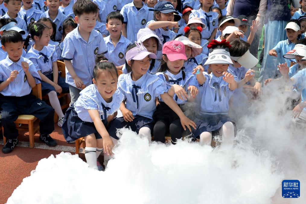 5月30日,在山东省青岛市市北区宝城幼儿园开展的科技体验迎“六一”主题活动上,小朋友们感受干冰实验。