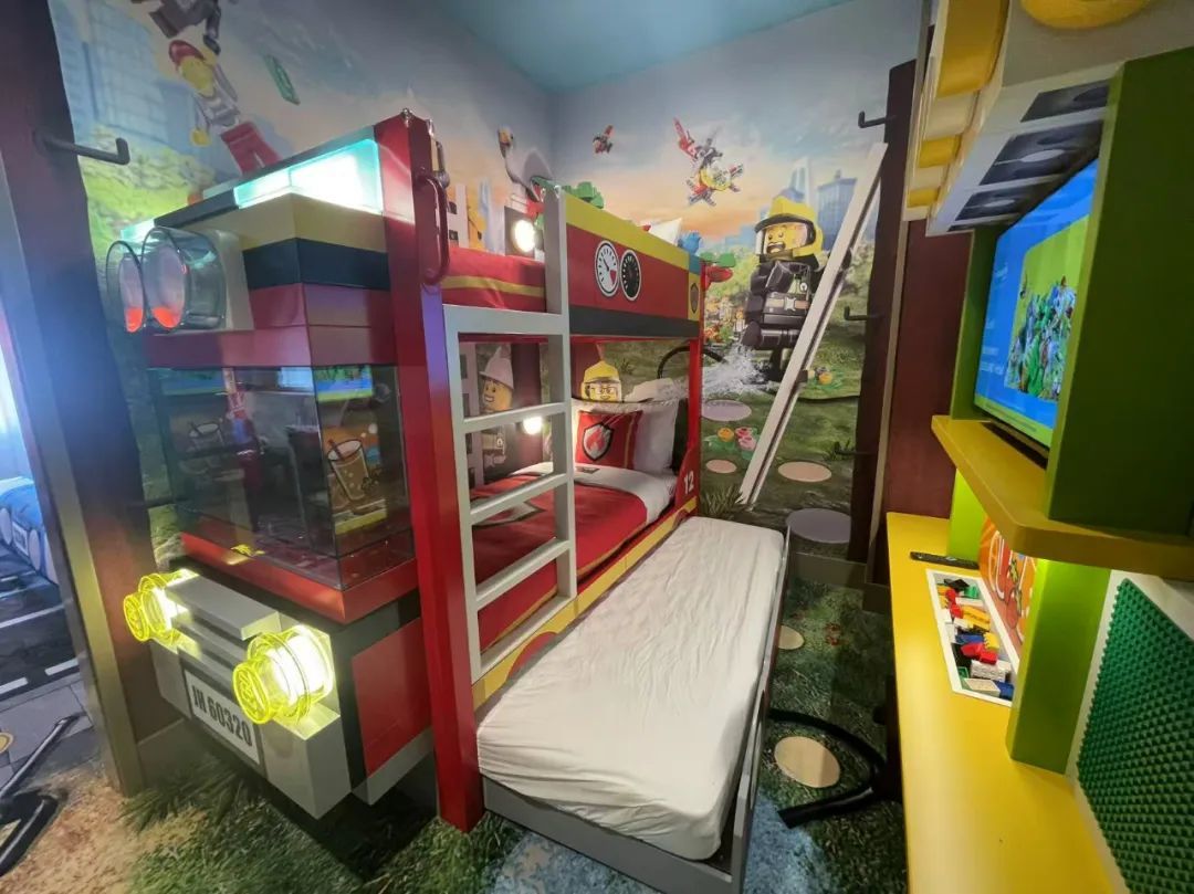 乐园酒店拥有250间主题客房,每间房设有里外两间,内间一张大床,外间看似一张高低两人床,实则从床底还能抽拉出一张床,所以一套客房最多可入住五人。房间还配有乐高积木,乐高角色搭搭、香蕉人仔每天也会出现在酒店,与小朋友见面互动。