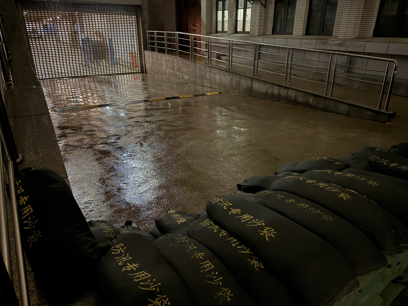 武汉大学文理学部图书馆的地下停车场的入口是一个斜坡,斜坡门口早已摆上沙袋。