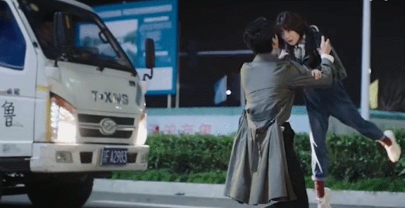眼看着女主就要撞车,男主一把将女主甩到飞起,然后两个人一块往后退。