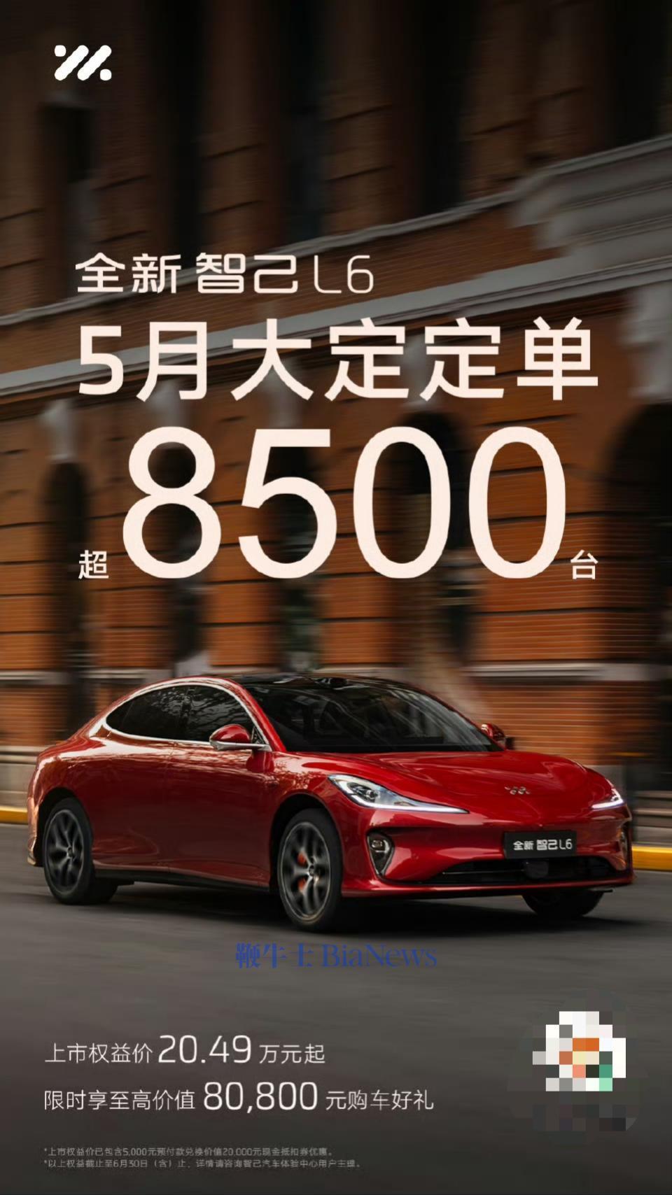 6月1日,智己汽车宣布,2025年5月,全新智己L6大定超8500台。