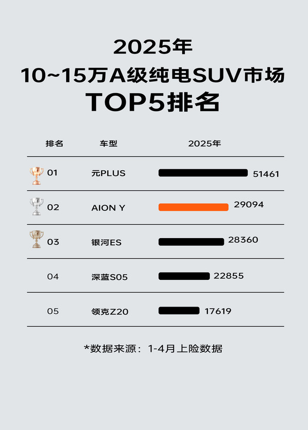 【CNMO科技消息】在竞争日益激烈的10-15万A级纯电SUV市场,谁才是消费者真正信赖的选择?2025年1-4月最新销量数据显示,比亚迪元PLUS以5.1万台的销量位居第一,而埃安Y凭借强大的产品力,以2.9万台的成绩位居A级纯电SUV销量TOP2,再次证明了这款“国民纯电SUV”的硬核实力。