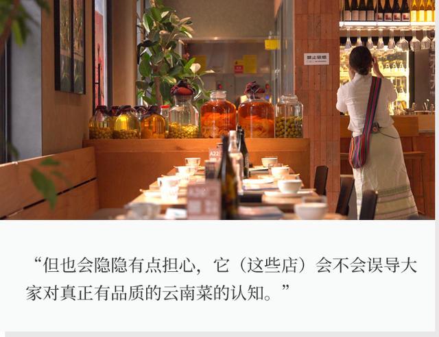 “我其实一直也在关注这股风,因为它让云南菜被更广泛地认知,这其实是一件好事情,但也会隐隐有点担心,就是它会不会误导大家对真正有品质的云南菜的认知。因为有的店我也去过,基本上是打着云南菜的旗号,但从菜单上就能看出来,云南菜的食材占比非常低,所以它只能说是创新云贵菜。我甚至怀疑他们主厨可能没去过云南。”