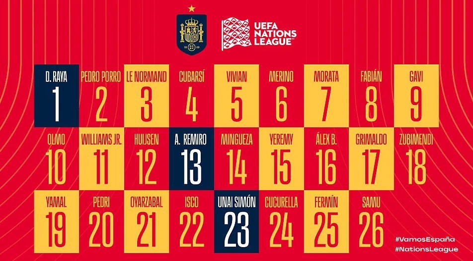 周日,西班牙足协官方发布公告,公布了本期西班牙队大名单的球衣号码安排。