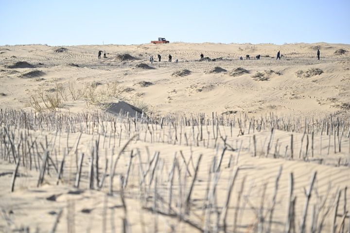 浑善达克沙地上工人们正在加紧治沙。(摄于2025年4月22日)新华社记者 贺书琛 摄