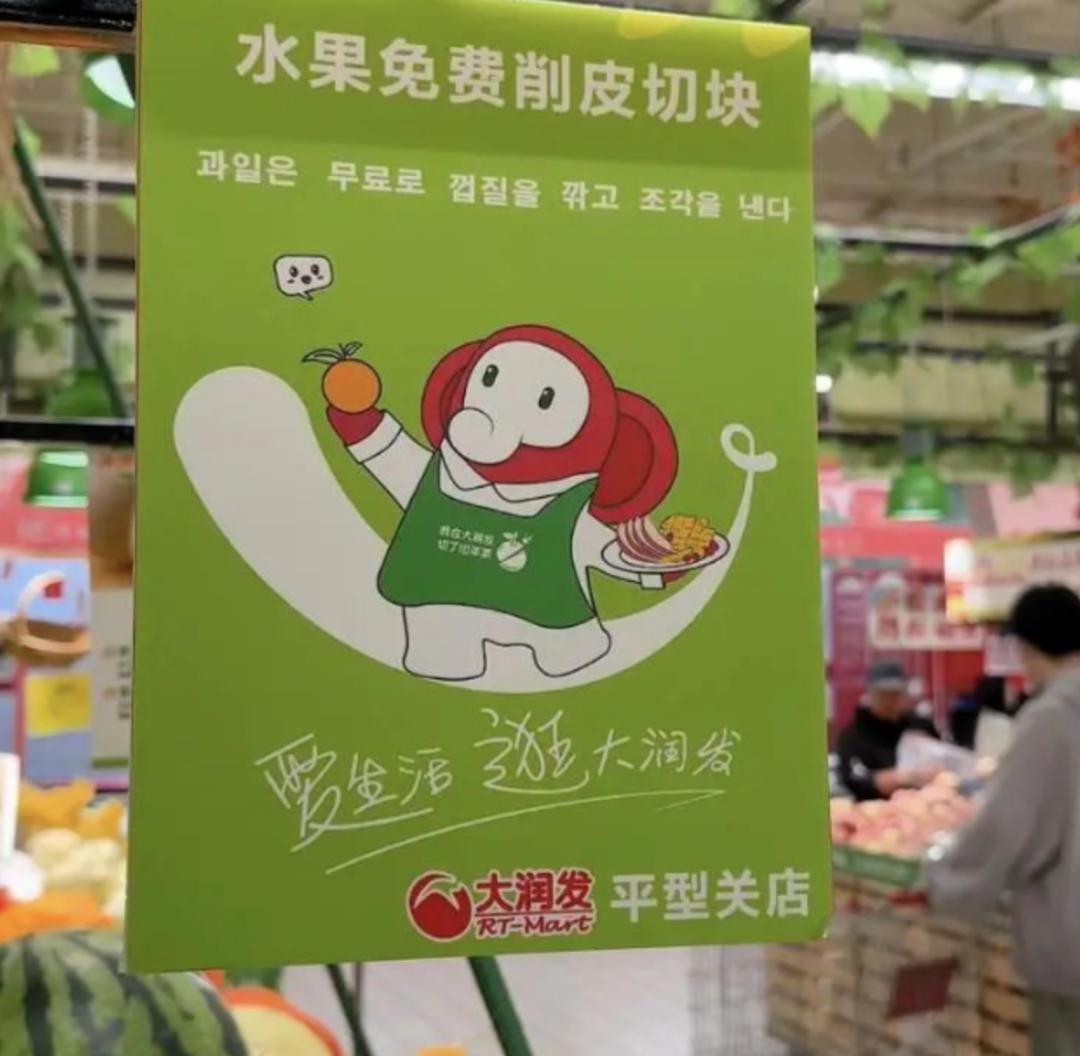 知道来中国旅游的韩国人对水果爱得深沉,大润发就在水果区竖起“免费削皮切块”的招牌。