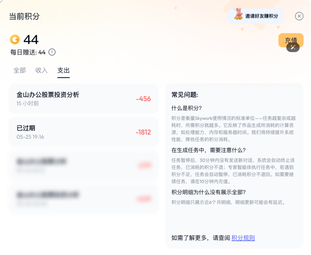 比如 Lovart 平均每个任务大概花费 300 积分,就是 3 刀(人民币约 21.5 元);天工每个任务花费约 500 积分,大概一刀(人民币 7.2 元)。