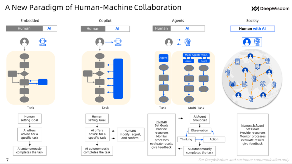 现在大部分人还停留在图中的第一和第二阶段:嵌入阶段和 Copilot 阶段。也就是 AI 给你建议,人类再手动决策、手动执行、手动收尾。